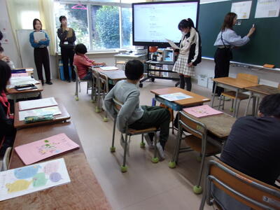 今日の1校時目に1年生が外国語の授業を行っていました。ALTの先生と担任の先生が連携して楽しく授業を進めていました。子ども達は物の形を英語で言うと何という単語なのかを学習したり、発音の練習をしたり楽しく取り組んでいました。