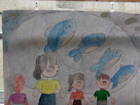 1年生の廊下の作品 遠足で見た江ノ島水族館の生き物たちが描かれていました。