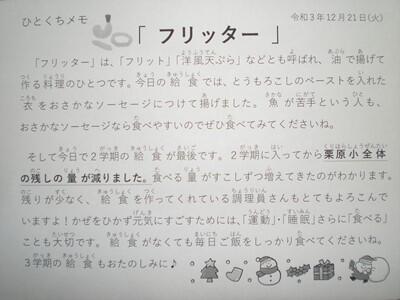 調理が大変なものばかりですが、2学期最後の給食を子どもたちに喜んでもらいたいという、栄養士さん・調理員さんの気持ちが伝わってきました。