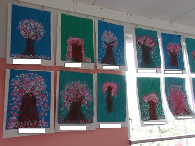 2年生の廊下に桜の絵が掲示されていました。