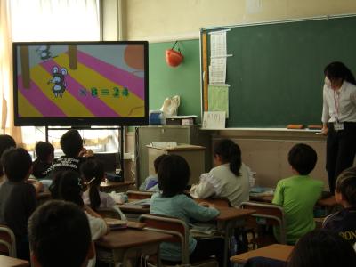 今日の2校時目に3年生のクラスで算数の授業を行っていました。2年生で習った九九を歌で振り返り、a×□=b、