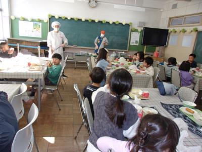 今日は4年4組がランチルーム給食でした。栄養教諭の先生から「感謝して給食を食べましょう」という話がありました。調理員さん達は作るだけではなく、全校分の食器を洗うのに毎日だいたい1時30頃から4時頃までかかっているという話もありました。みんなが協力できることはお皿に残菜が残ったまま食器を下げずに、きれいな状態で返すことです。もちろん完食できるともっといいですね。