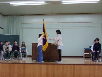 そして、新役員は力強い抱負を発表してくれました。具体的に新しい取り組みを話してくれ、頼もしい限りです。新役員が承認されると前会長から新会長へ児童会旗が引き継がれました。