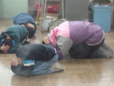 今日は避難訓練がありました。無告知の訓練で中休みに行われました。放送を聞いて、先生がいなくても自分たちで行動できるかという訓練でした。教室にいる子は机の下にもぐり、校庭にいる子は真ん中に集まり、低くダンゴムシのポーズで揺れが収まるのを待ちました。