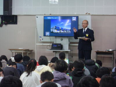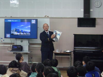 本日、3校時目に6年生がキャリア教育の授業を講師の方をお迎えして行いました。相鉄バスの運転士の佐藤信之さんです。バスの運転士になるにはどうしたらよいか、お仕事の様子、苦労されていること、お仕事をしていてよかったなと思うこと、やりがいなどを話してくだいました。子どもたちは興味深く、話を聞いていました。佐藤さんから今勉強していることは将来どんな職業についても、1つも無駄にはならないことを教わりました。これから職業人口の不足が予想され、AIなどに仕事が変わっていく状況もあるかもしれないこともあるかもしれません。しかし、人と人とのコミュニケーション、人との結びつきは大切にしていかなくてはいけないことなどたくさんのことを講話を通して、子ども達にメッセージを送ってくださいました。質問もたくさん出ました。鉛筆やファイルなどのお土産も頂き、感謝申し上げます。
