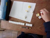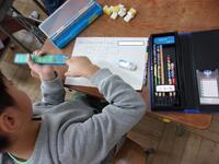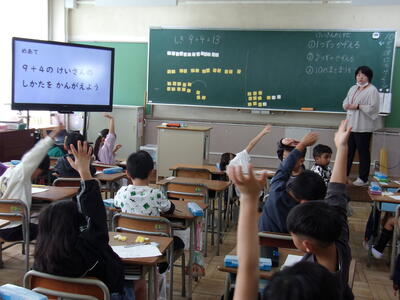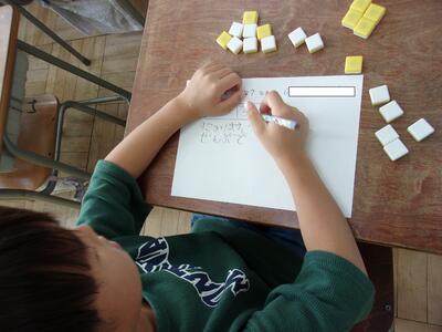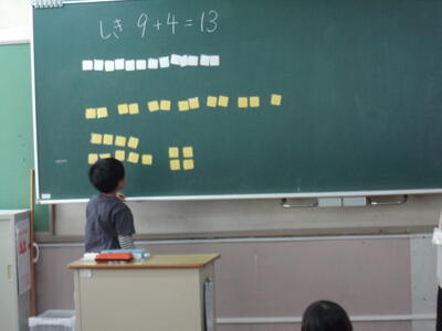 今日の2校時に1年生が算数のくりあがりのあるたし算の学習を行いました。今まで「いくつといくつで10になる」という10の数の構成や「10といくつを合わせると」というたし算は今までに学習をしてきました。今日は1位数どうしをたして、繰り上がりのあるたし算の学習でした。教師が身近にあるグミやリンゴ、おにぎりなどを例題にしてイメージがわきやすいよう工夫がありました。その後一人一人がブロックを操作して、10のまとまりを意識した授業でした。子どもたちは図や言葉で考えをまとめて意欲的に取り組んでいました。