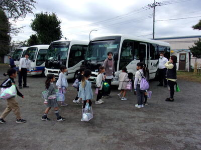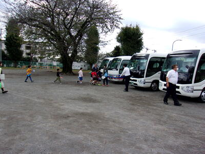 今日は2年生、特別支援学級、6年生の児童が水泳の授業に参加しました。とても嬉しそうにバスに乗り込みました。