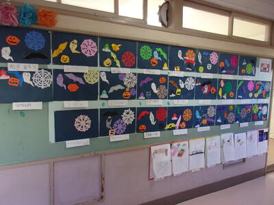 1年生の廊下の作品 遠足で見た江ノ島水族館の生き物たちが描かれていました。
