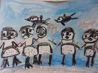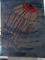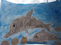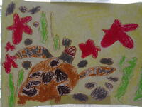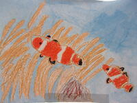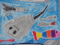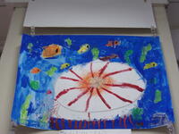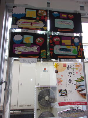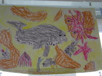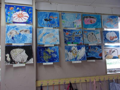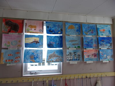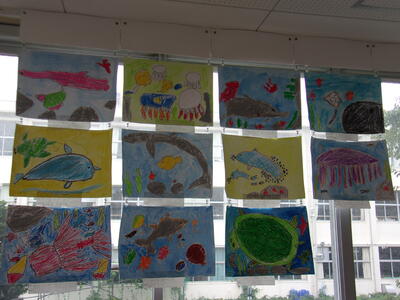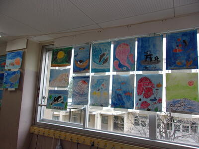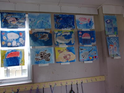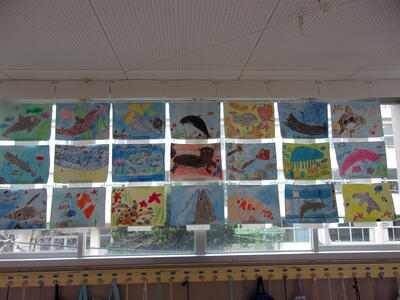 1年生の廊下の作品 遠足で見た江ノ島水族館の生き物たちが描かれていました。