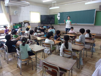 今日の1校時目に1年生が外国語の授業を行っていました。ALTの先生と担任の先生が連携して楽しく授業を進めていました。子ども達は物の形を英語で言うと何という単語なのかを学習したり、発音の練習をしたり楽しく取り組んでいました。