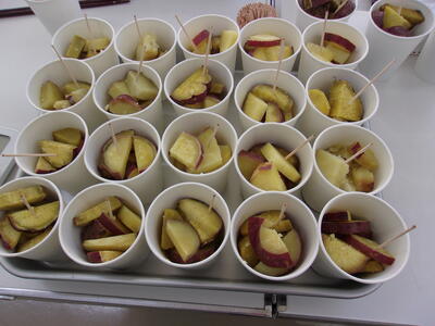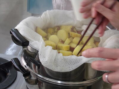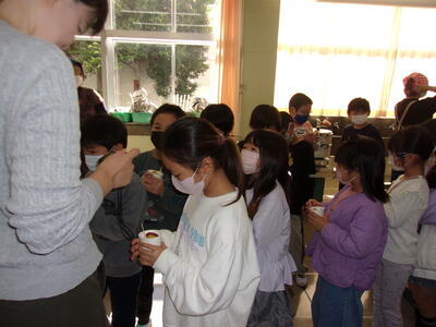 今日の2校時目に甘い香りが家庭科室から漂ってきました。2年生が育てて収穫したさつまいもをボランティアの方がおいしくふかして下さいました。一人ずつ紙コップに入れたものを教室で食べました。子どもたちは「あったかい。」「ほかほか。」「おいしい。」と言いながらおいしく食べました。曽根さんから追加のさつまいもも一緒に調理させて頂きました。