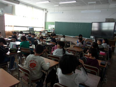 1年生の教室で、マットの回り方を動画を見ながら学習していました。ポイントやコツを学び、体育館へ移動しました。体育館では、先ほどビデオで見たイメージを思い出しながら、どの子も一生懸命頑張って練習していました。