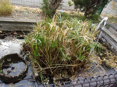 とても嬉しい出来事がありました。夏に「栗原小の玄関前の池の水が濁っていて掃除をしたい。」という声があり、その時から水を抜いた状態になっていました。ずっと乾燥させた状態状態を見ていました。