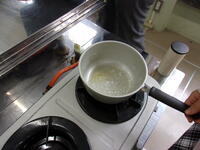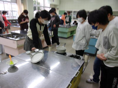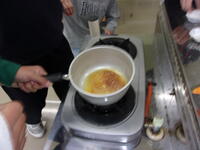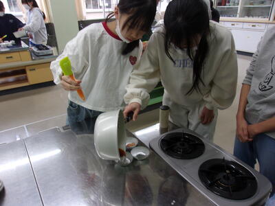 この写真は家庭科の授業ではなく6年生の理科の授業の様子です。水溶液の授業の発展で、砂糖が水に溶ける学習で、べっこう飴に変化するところを学習しています。最後に味見をして、おいしく食べました。