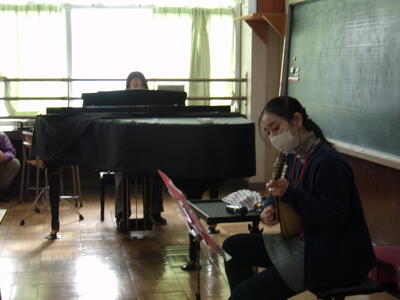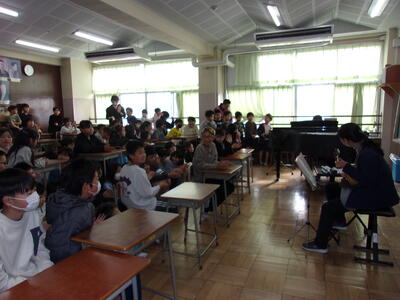今日の中休みに、音楽室で有志の教職員によるクリスマスコンサートが行われました。マンドリンとピアノの素敵な音色が奏でられ、クリスマスにぴったりなコンサートになりました。今日の参加者は1・3・5年生でした。会場は満員で席が埋め尽くされ、立ち見の子も出るほどの大盛況でした。あっという間の10分間でした。子どもたちに喜んでもらえたらという思いで開催されました。素敵なひとときをありがとうございました。