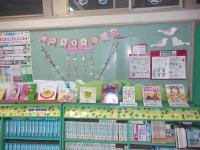 学校図書館の廊下です。ひな祭りや春にちなんだ本が飾られていました。雨の日は本を読んで、静かに室内で過ごせると良いですね。