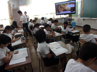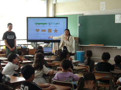 今日の1校時目に1年生が外国語の授業を行っていました。ALTの先生と担任の先生が連携して楽しく授業を進めていました。子ども達は物の形を英語で言うと何という単語なのかを学習したり、発音の練習をしたり楽しく取り組んでいました。