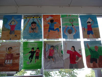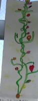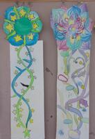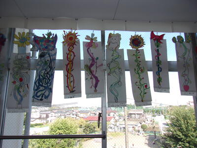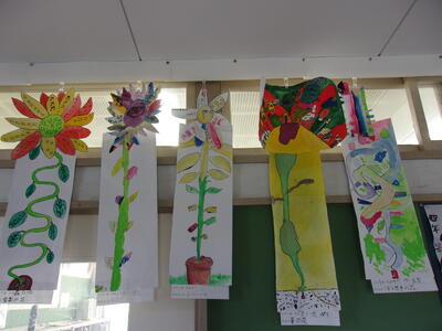 4年生の廊下の作品です。不思議なタネからきれいな花が咲いていました。