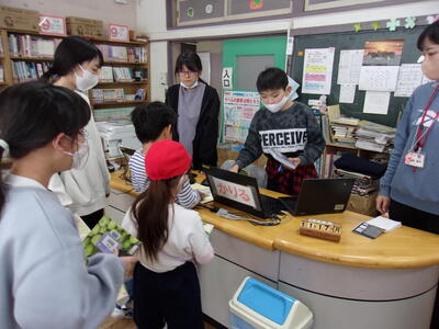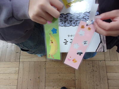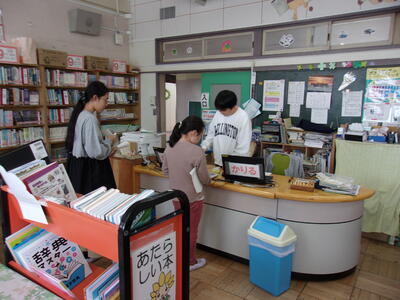 休み時間の図書室の様子です。たくさんの子が本を借りに来ていました。スタンプラリーを行っています。可愛い素敵な栞もたくさんあって、どれにしようか迷いますね。
