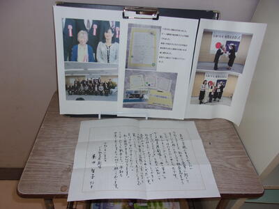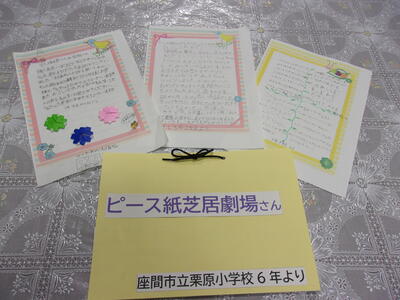 11月3日(月)文化の日に市で表彰式が行われました。長年、教育の分野で功績があったピース紙芝居劇場の兼田さんが表彰を受けました。36年間にわたって座間市の子ども達に「交通安全劇場」も上演してくださっていました。本校でも今年の1学期に3年生や6年生に向けて戦争や平和に関する紙芝居を上演してくださいました。1学期の終業式には全校に向けて「ゆきちゃんとドロップス」の紙芝居を上演してくださいました。座間市の子ども達を代表して栗っ子たちが紙芝居のお礼や感想、受賞のお祝いの気持ちを手紙に書きました。兼田さんたちに受賞の日にお渡しすると大変喜んでくださいました。おめでとうございました。
