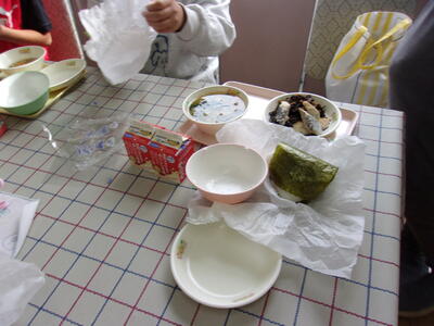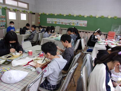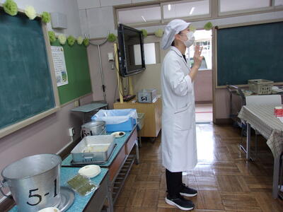 今年度よりランチルーム給食が再開されました。ランチルームにクラス毎に移動して給食を食べます。5年1組がトップバッターです。今年度は米飯を握っておにぎりにしました。おちゃわんのご飯にふりかけを入れて、クッキングシートに包んで握りました。最後に海苔を巻いて完成です。どの子も上手に握ることができました。栄養教諭の先生がみんなが簡単にできるように工夫をして下さいました。自分で握ったおにぎりはとてもおいしかったことでしょう。お家でも是非作ってみて下さい。