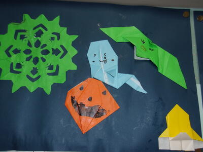 特別支援学級の廊下の掲示です。カラフルで素敵な作品がたくさん並んでいますね。